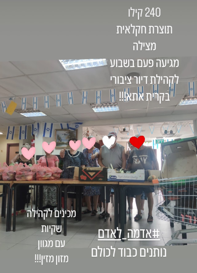 חברנו ל3 נשים מנהריה שמבשלות כל שבוע אוכל ביתי מפנק לגדודי חיילים על גבול לבנון. מאז אוקטובר הן מוציאות מכיסן כסף לרכוש את חומרי הגלם. אנחנו מספקות להן בשבוע 100-300 קילו תוצרת חקלאית מזינה במחיר 1 ש״ח לקילו. את העודפים הן נותנות למשפחות מפונים משתולה וישובי הגליל המפונים ולמשפחות על קו העוני בעיר.