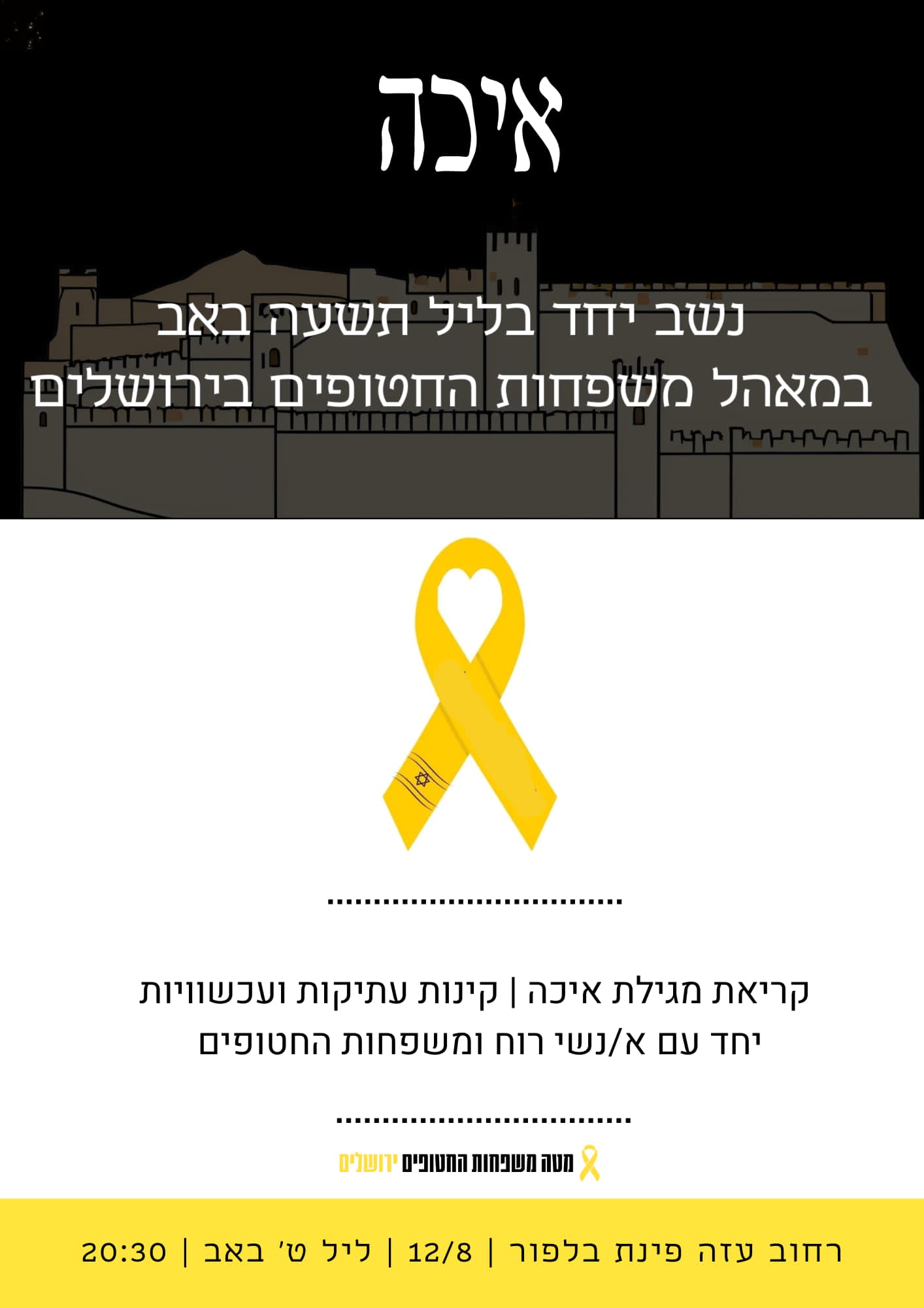 "אירוע ט' באב במאהל החטופים בירושלים - קריאת מגילת איכה וקינות עתיקות ועכשוויות עם אנשי רוח ומשפחות החטופים"